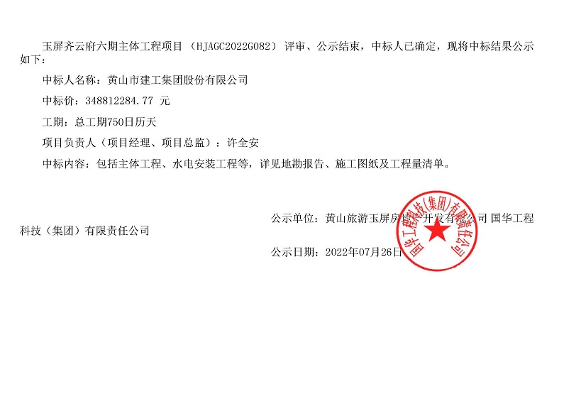 7月22日公司经营一线再传捷报,一举中标了至今为止我公司史上中标的最大单位建筑项目--玉屏齐云府六期主体工程,总建筑面积约15.1万平方米,总造价348812284.77 元,为公司赢得了良好的社会效益。