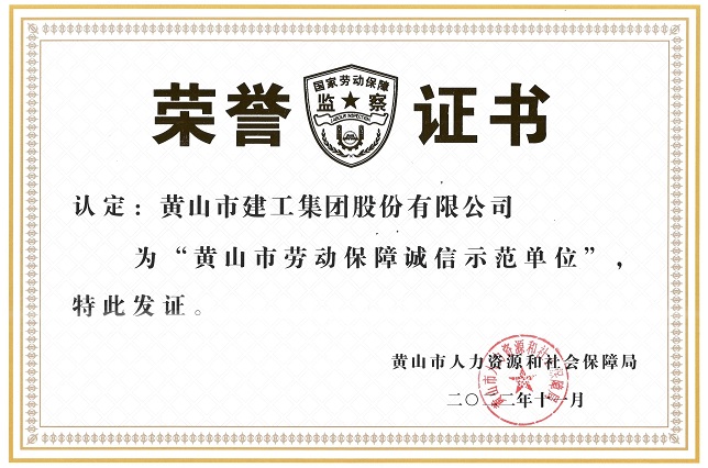 荣获 “黄山市劳动保障诚信示范单位”的称号。多年来,集团坚持以人为本,始终把劳动者的权益放在第一位,高度重视劳动保障建设和职工权益的保障工作。严格遵守劳动保障的法律法规,依法依规制定。并完善劳动用工的管理制度,规范用工流程,提升企业劳动用工的管理水平。