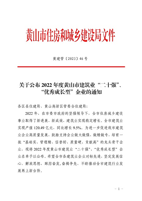 实力担当!黄山建工荣获“2022年度黄山市建筑业二十强企业”称号