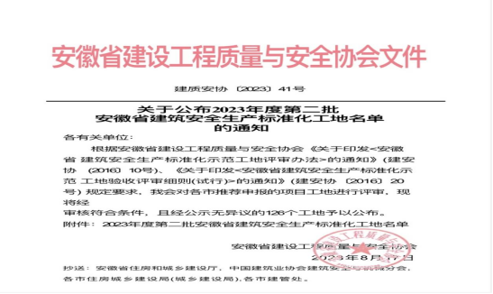 8月17日,安徽省建设工程质量与安全协会发布2023年度第二批安徽省建筑安全生产标准化工地名单,华体会体育官方网站 - 华体会体育(中国) 仙人洞南路东侧D1地块(文澜轩)项目获评“安徽省建筑安全生产标准化工地”。