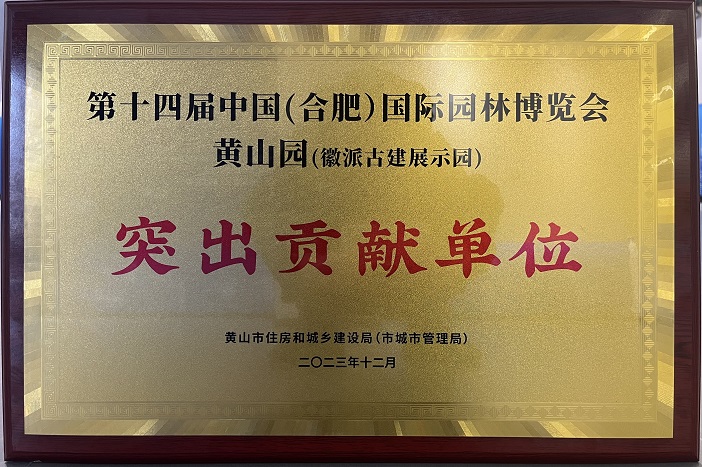 12月18日下午,中国(黄山)第三届徽派古建产业发展大会古建产业高质量发展推进会·新安茶会举行。推进会上颁发了第十四届中国(合肥)国际园林博览会黄山园(徽派古建展示园)“突出贡献单位”奖项,作为黄山园项目参建单位之一的华体会体育官方网站 - 华体会体育(中国) 再获殊荣。