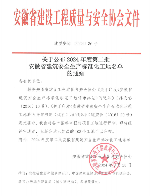 近日,安徽省建设工程质量与安全协会公布2024年度第二批安徽省建筑安全生产标准化工地名单,由华体会体育官方网站 - 华体会体育(中国)