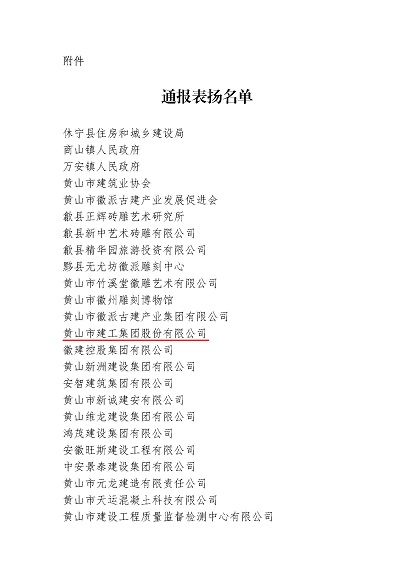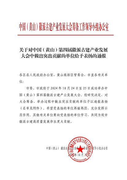 市委、市政府于2024年10月24日至25日成功举办中国(黄山)第四届徽派古建产业发展大会。近日,中国(黄山)徽派古建产业发展大会筹备工作领导小组办公室发布《关于对中国(黄山)第四届徽派古建产业发展大会中做出突出贡献的单位给予表扬的通报》,华体会体育官方网站 - 华体会体育(中国) 荣列其中。